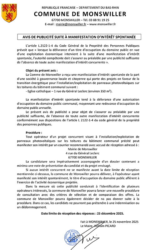 AVIS DE PUBLICITÉ SUITE À MANIFESTATION D’INTÉRÊT SPONTANÉE portant sur l’installation/exploitation de panneaux photovoltaïques sur la toiture de l’Église catholique 1 rue du Général Leclerc (environ 350 m²).