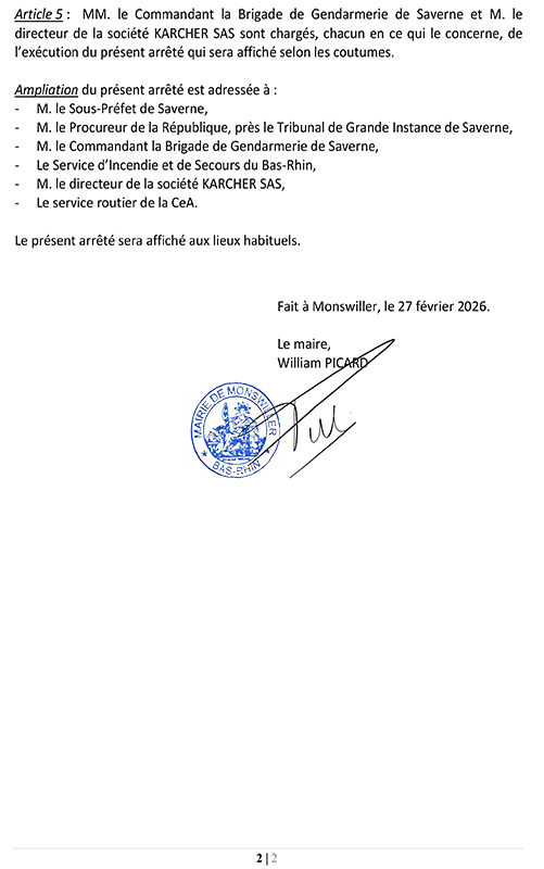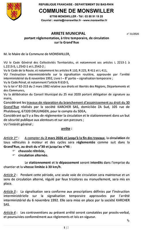 Ci-joint un arrêté portant règlementation, à titre temporaire, de la circulation sur la Grand’Rue.