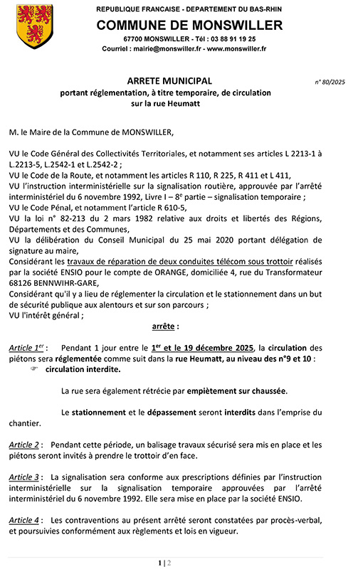 Arrêté portant règlementation, à titre temporaire, de la circulation rue Heumatt