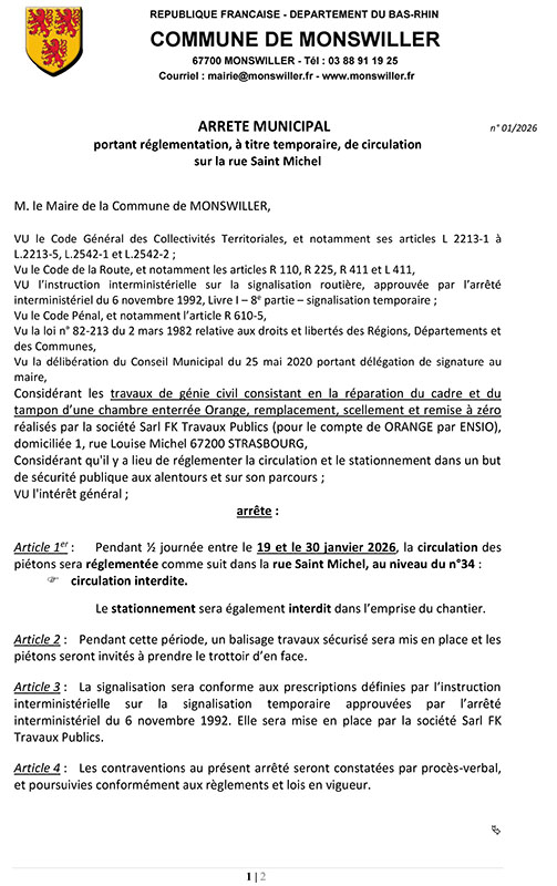 Arrêté portant règlementation, à titre temporaire, de la circulation sur la rue Saint-Michel