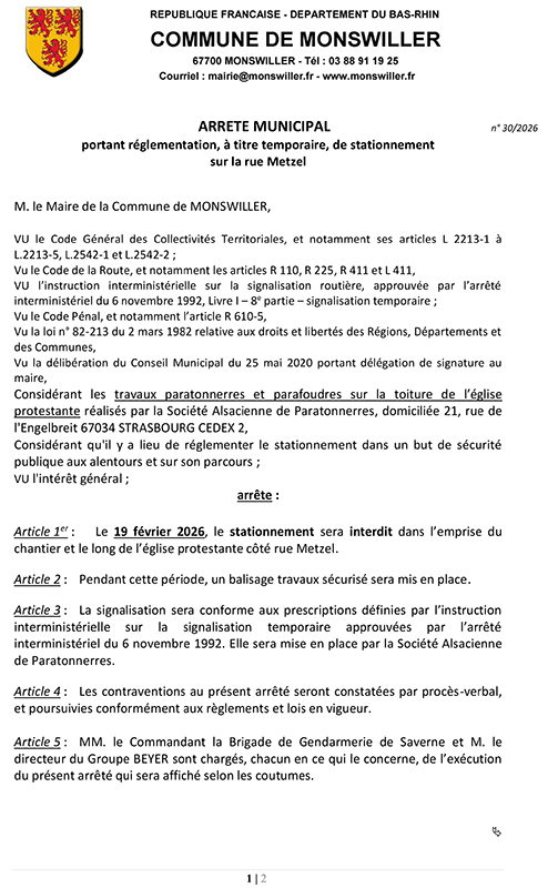 Ci-dessous un arrêté portant règlementation, à titre temporaire, du stationnement dans la rue Metzel, le long de l’église protestante.
