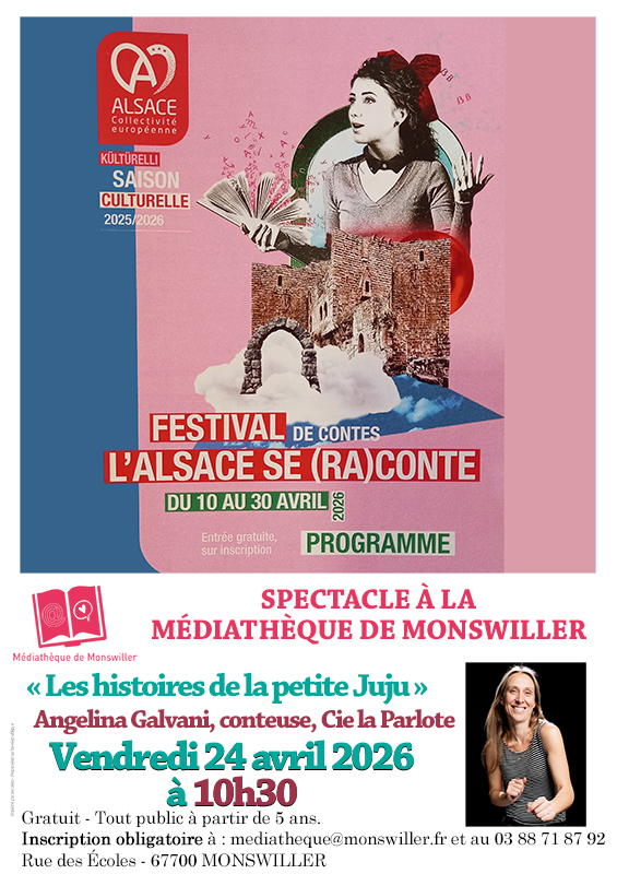 Dans le cadre du festival L’Alsace se (ra)conte, dédié aux contes et aux arts de l’oralité, organisé par la Collectivité européenne d’Alsace, la Médiathèque de Monswiller accueille un spectacle le vendredi 24 avril 2026 à 10 h 30. Venez découvrir ''Les histoires de la petite Juju'', un conte de Angelina Galvani.