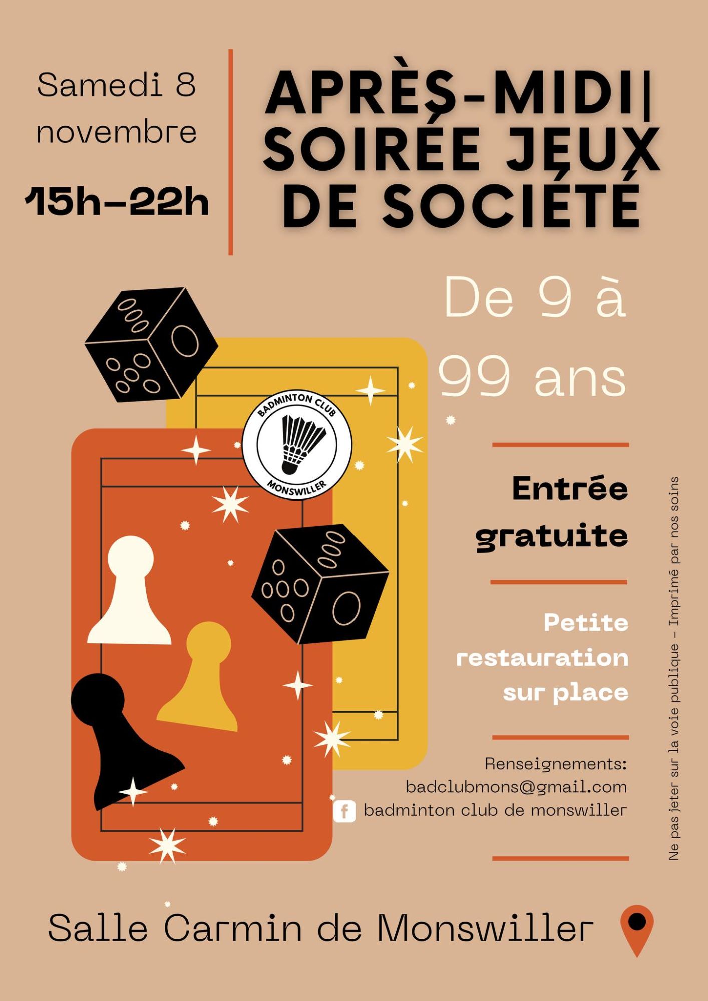 L’association du Badminton Club de Monswiller organise le samedi 8 novembre 2025 de 15 heures à 22 heures un après-midi et une soirée jeux de société à la salle Carmin pour tous, de 9 à 99 ans. Entrée libre et gratuite. Petite restauration sur place.