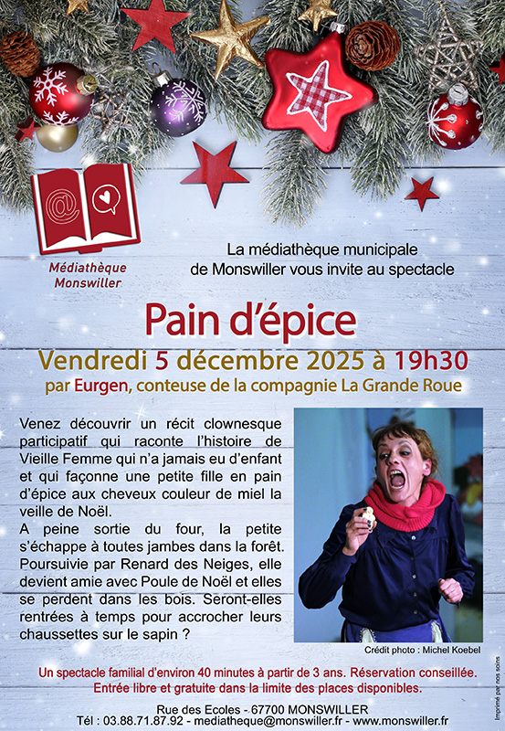 La médiathèque de Monswiller vous convie à un voyage festif avec le spectacle ‘‘Pain d'épice" qui se déroulera le vendredi 5 décembre 2025 à 19 h 30. Petits et grands découvriront l'histoire de Vieille Femme qui n'a jamais eu d'enfant et qui façonne une petite fille en pain d'épice aux cheveux couleur de miel la veille de Noël.