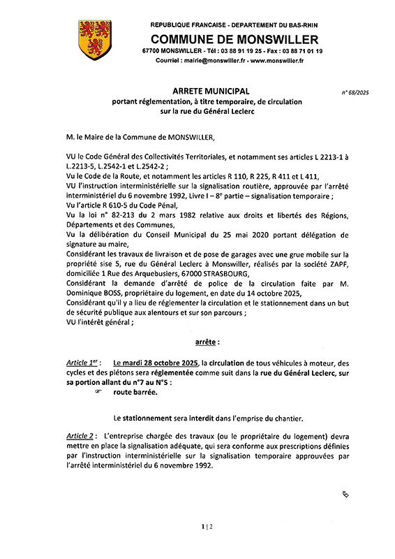Arrêté municipal portant réglementation, à titre temporaire, de circulation sur la rue du Général Leclerc