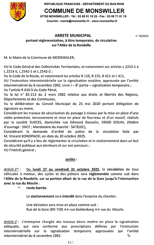 Vous trouverez ci-joint un arrêté portant règlementation, à titre temporaire, de la circulation Allée de la Rondelle.