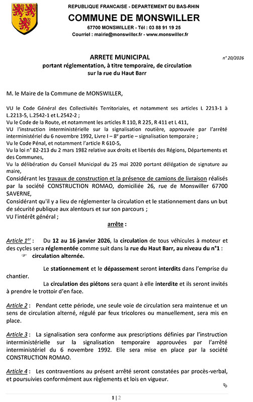 Arrêté portant règlementation, à titre temporaire, de la circulation sur la rue du Haut-Barr