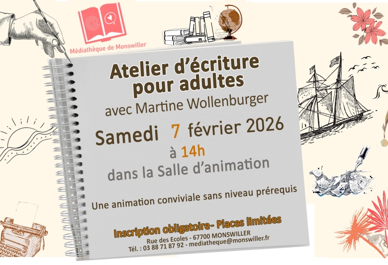 La médiathèque vous invite à son animation "Atelier d’écriture pour adultes", une séance animée par Martine Wollenburger. Rendez-vous samedi 7 février 2026 à 14 h. Gratuit. Inscription obligatoire à mediatheque@monswiller.fr ou par téléphone au 03 88 71 87 92.
