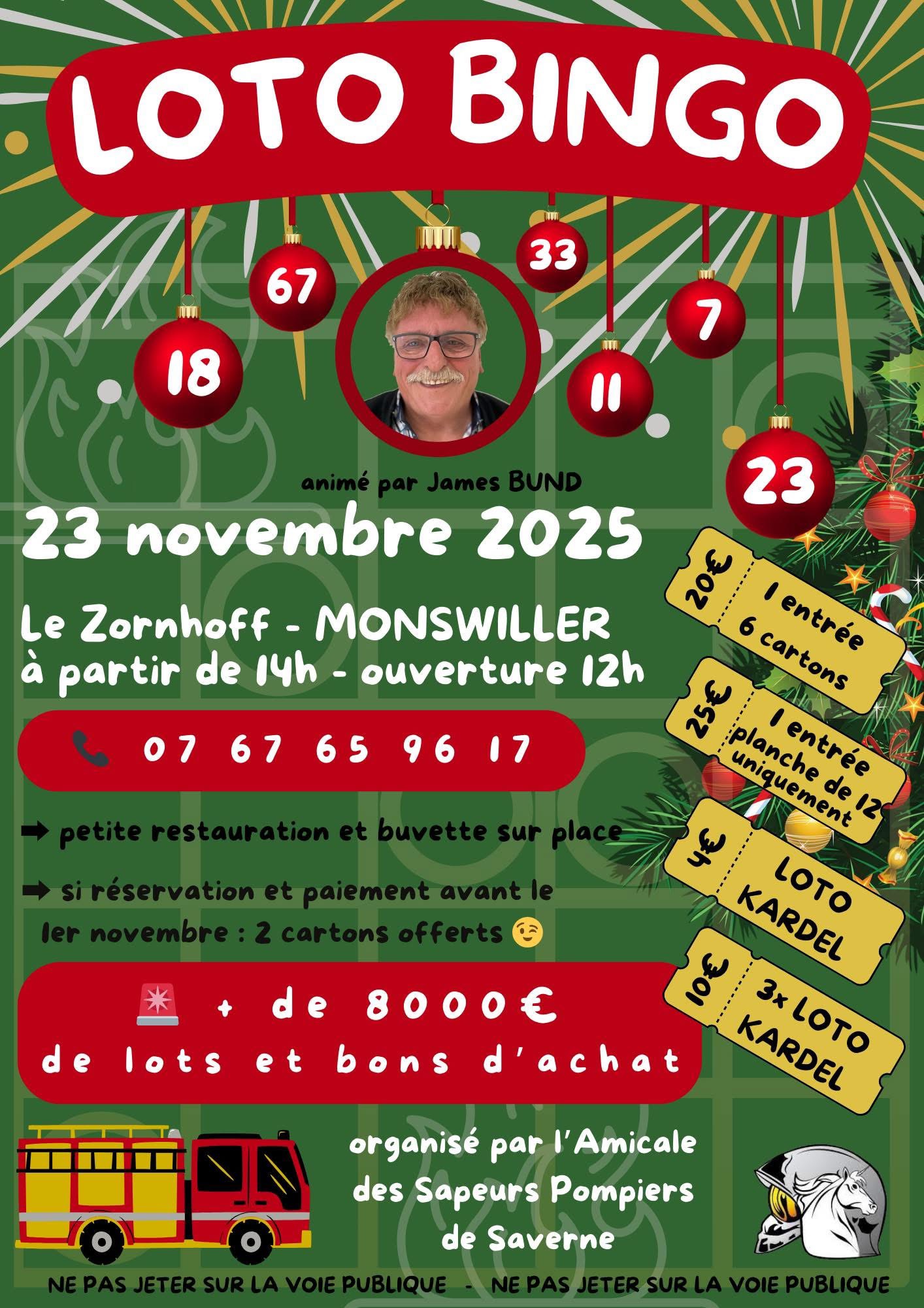 L’Amicale des Sapeurs-Pompiers de Saverne vous donne rendez-vous le dimanche 23 novembre 2025 pour son grand Loto Bingo organisé à l’espace culture et loisirs « le Zornhoff » de Monswiller.