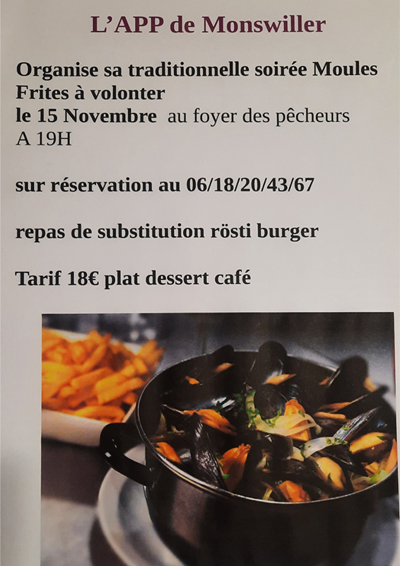 Un repas moules frites sera organisé le samedi 15 novembre 2025 à partir de 19 h 00 à l’étang de pêche. Repas de substitution : rösti burger. Dessert pour tous. Réservations obligatoires : Marie-Pierre KLEIN au 06 18 20 43 67. Tarif : 18 €.