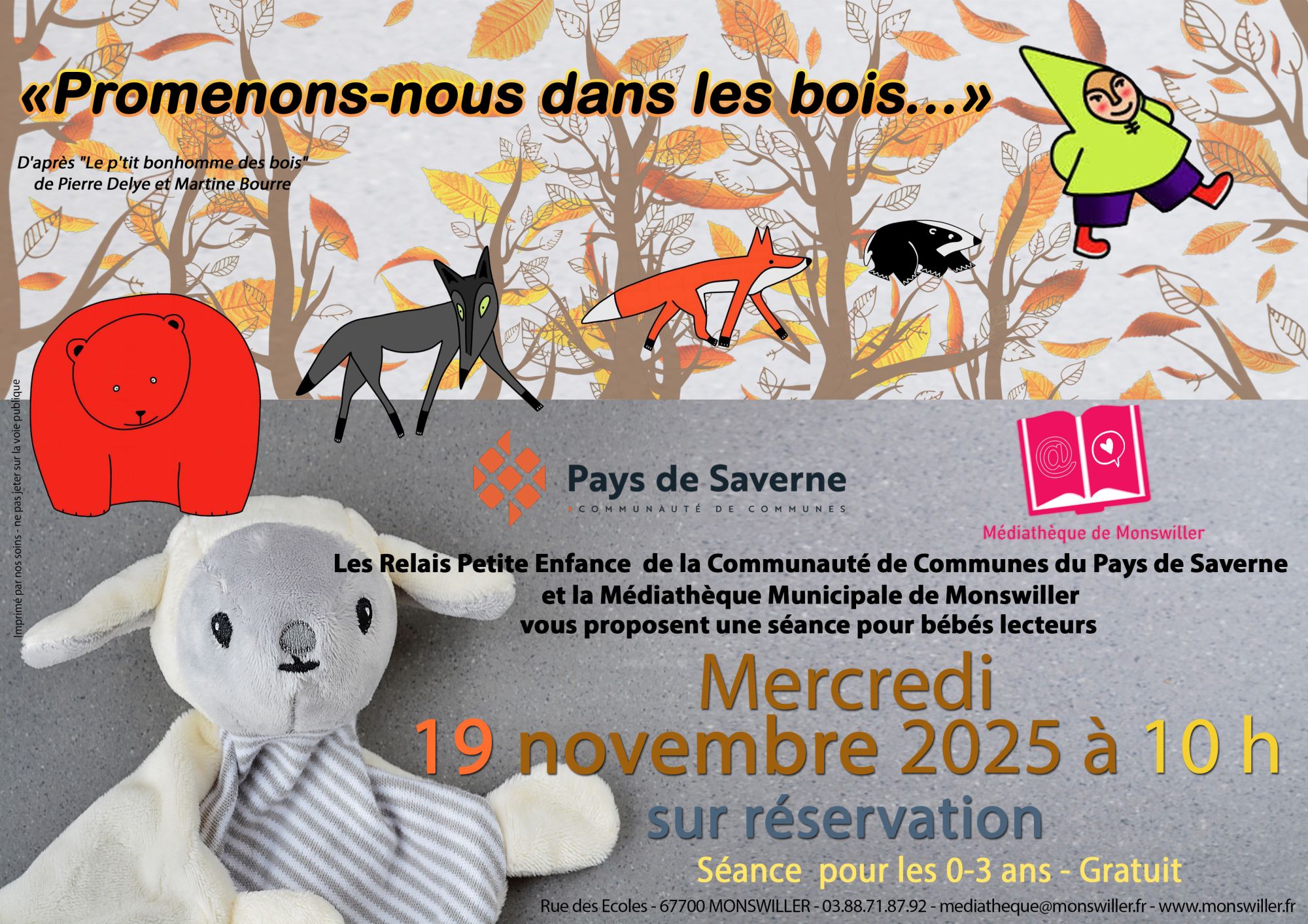 Les Relais Petite Enfance de la Communauté de Communes du Pays de Saverne et la Médiathèque de Monswiller invitent les tout-petits et leurs accompagnants à un moment privilégié et convivial lors de sa séance "Bébés Lecteurs", qui se tiendra le mercredi 19 novembre 2025 à 10 h.