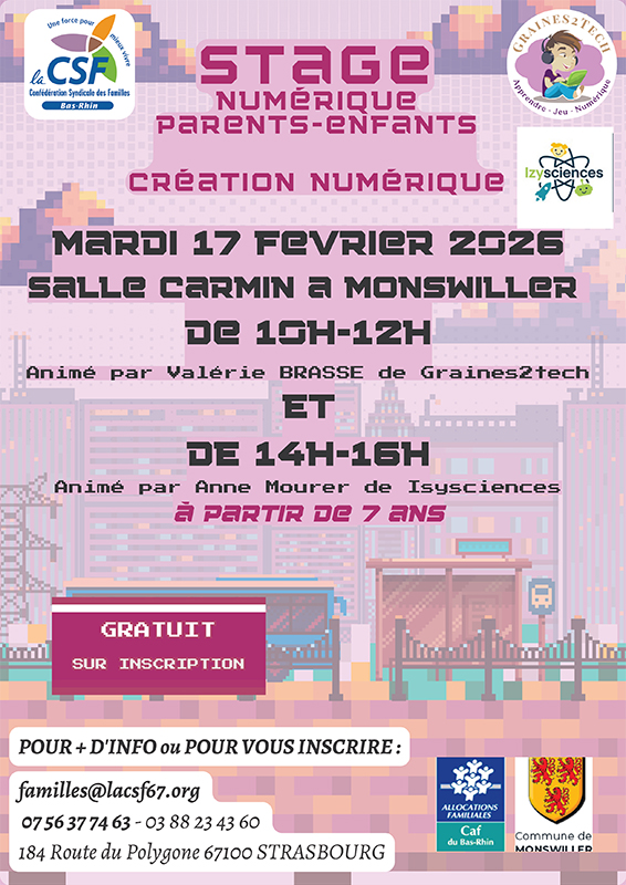 Stage numérique parents-enfants autour de la création numérique le mardi 17 février 2026 à la salle Carmin. Cette journée est spécialement pensée pour permettre aux familles de découvrir ensemble les usages du numérique de façon ludique et créative. Deux temps sont proposés : de 10h à 12h, un atelier animé par Valérie Brasse de Graines2Tech et de 14h à 16h, un second atelier animé par Anne Mourer d’Isysciences. Accessible à partir de 7 ans, ce stage permet aux enfants et à leurs parents de partager un moment de découverte, d’expérimentation et de créativité autour du numérique. Participation gratuite, sur inscription.