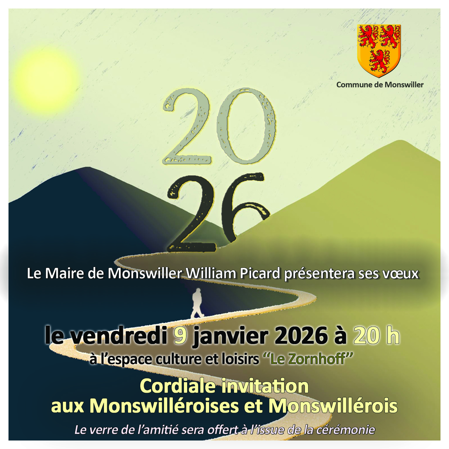 Le Maire de Monswiller, William Picard, aura le plaisir de présenter ses vœux pour la nouvelle année le vendredi 9 janvier 2026, à 20 h 00, à l'Espace Culture et Loisirs Le Zornhoff. Il invite chaleureusement l'ensemble des administrés à venir partager ce moment de convivialité. Un verre de l’amitié sera offert à l'issue de la cérémonie, permettant ainsi de prolonger les échanges dans une ambiance chaleureuse et cordiale.